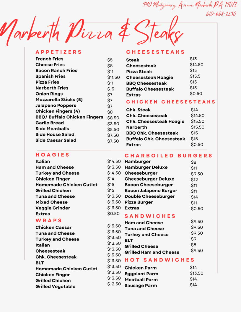 With its extensive and well-priced menu, Narberth Pizza and Steaks provides a great dining experience whether you’re in the mood for a quick snack or a full meal.