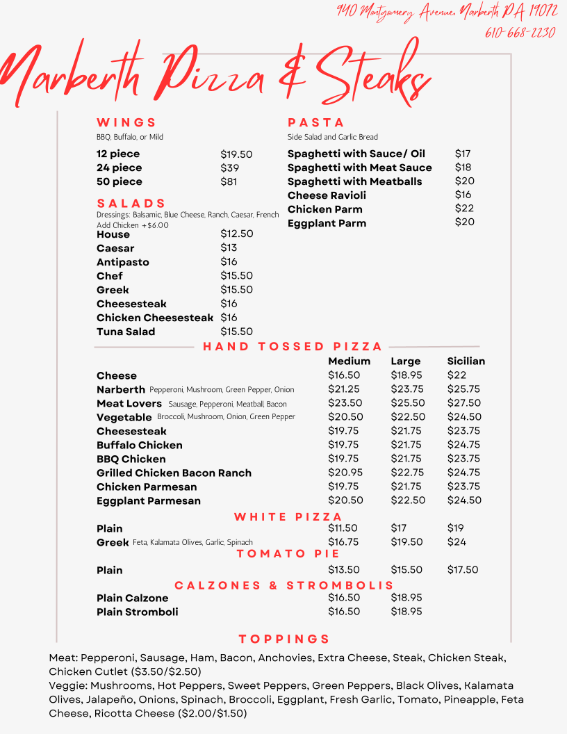 Their Hand Tossed Pizza is a highlight, offering options like the traditional Cheese, the neighborhood favorite Narberth, Meat Lovers, and the veggie-packed Vegetable Pizza. For a unique twist, try their Cheesesteak Pizza. If you’re in the mood for something a little different, their White Pizza and Tomato Pie come in delicious variations like Plain and Greek.